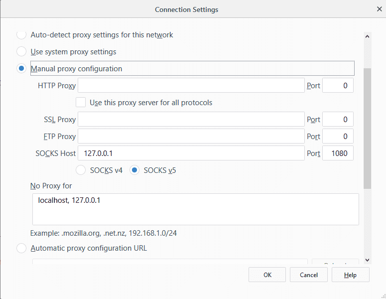 اگر بعد از اتصال باز هم صفحات فیلتر بود از فایرفاکس Options را کلیک کنید و از Advanced > Network مقدار زیر را در بخش Manual proxy configuration وارد کنید.